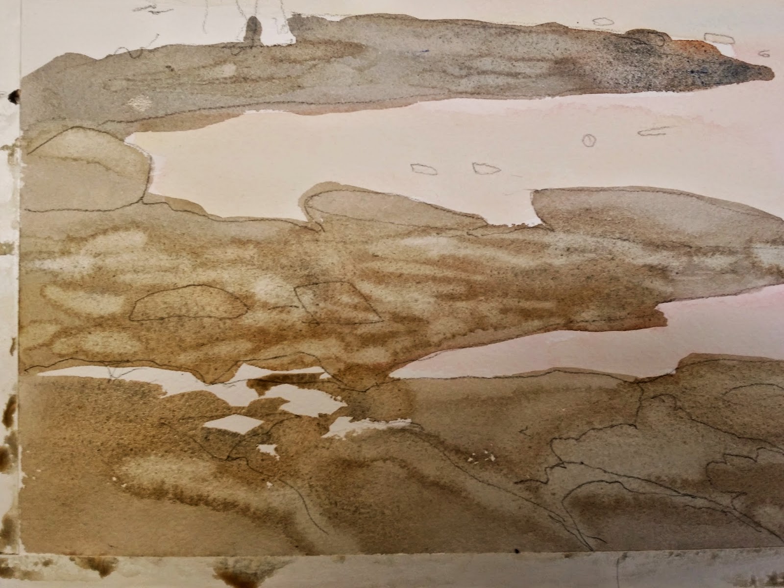 | Next I added the distant land mass starting with the upper edge in a bluegreen and pulling it down with fresh water to imply mist on the horizon. |